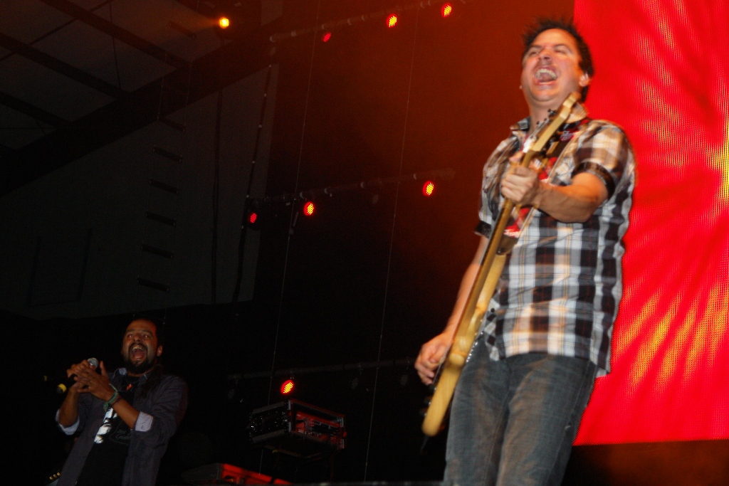 Giovanni Pinzón, siempre es un espectáculo, se movía en todo el escenario. A su lado, Álvaro Rodríguez y Rudy Betahncourt, se mostraban serios y concentrados en sus instrumentos. En el otro extremo estaba Rafael Echeverría, baterista invitado. Frente a él, el persistente Piolly se disfrutaba el concierto en el bajo, saludando a quienes le saludaban y coreando para sí las canciones. Sólo descansó, junto a Echeverría, cuando Bethancourt tomó la guitarra acústica y pasó al frente del escenario para interpretar, con Pinzón y Rodríguez, Aire, con El jardín como intro.